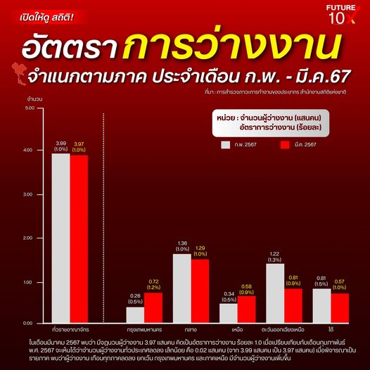 ในเดือนมีนาคม 2567 รายงานจากสำนักงานสถิติแห่งชาติพบว่า อัตราการว่างงานทั่วประเทศมีจำนวนผู้ว่างงานทั้งหมด 3.97 แสนคน ซึ่งลดลงเล็กน้อยจากเดือนกุมภาพันธ์ที่มีจำนวนผู้ว่างงาน 3.99 แสนคน โดยอัตราการว่างงานเฉลี่ยอยู่ที่ 1.0% เมื่อเปรียบเทียบรายภูมิภาค พบว่าอัตราการว่างงานในกรุงเทพมหานครและภาคกลางมีการเปลี่ยนแปลงอย่างเห็นได้ชัด ส่วนภาคตะวันออกเฉียงเหนือและภาคใต้ยังคงมีจำนวนผู้ว่างงานที่น่าสนใจ